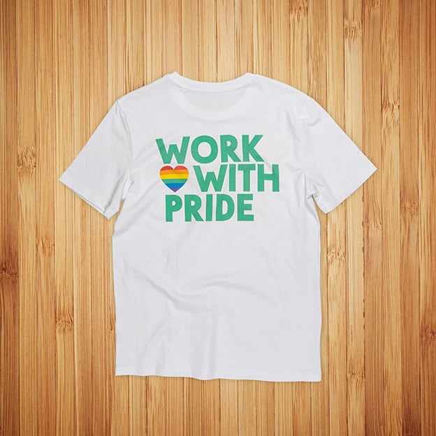 Osuuspankin t-paita painatus Työ ei syrji -kampanjapaitoihin painettiin seripainossa. Valkoinen painatus erottuu paidasta hyvin, kun painatuksen ja paidan värillä on keskenään suuri kontrasti.