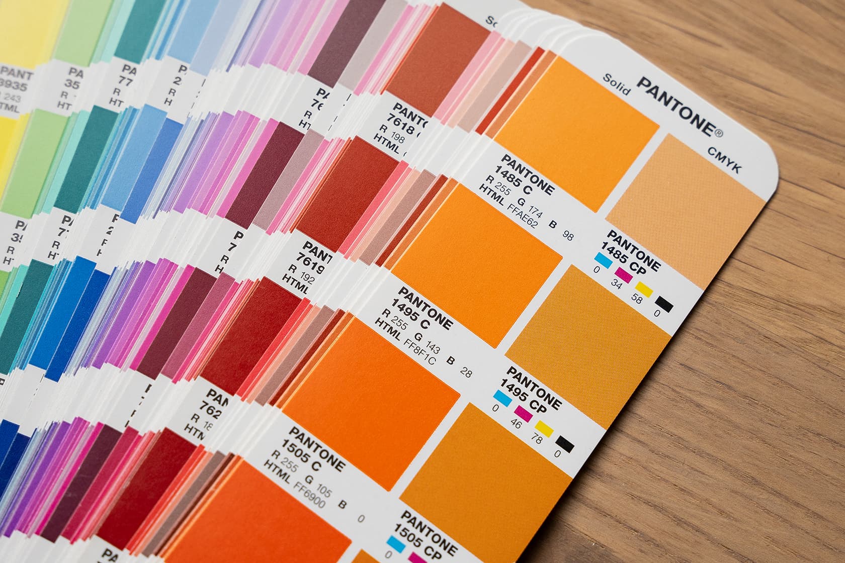 Pantone-värien ja CMYK-värien ero näkyy selkeiten Pantone-viuhkasta. Kuvassa on oransseja sävyjä, vasemmanpuoleiset sävyt ovat Pantone-värejä ja niiden oikealla puolella on lähin CMYK-väreillä toistettava väri.